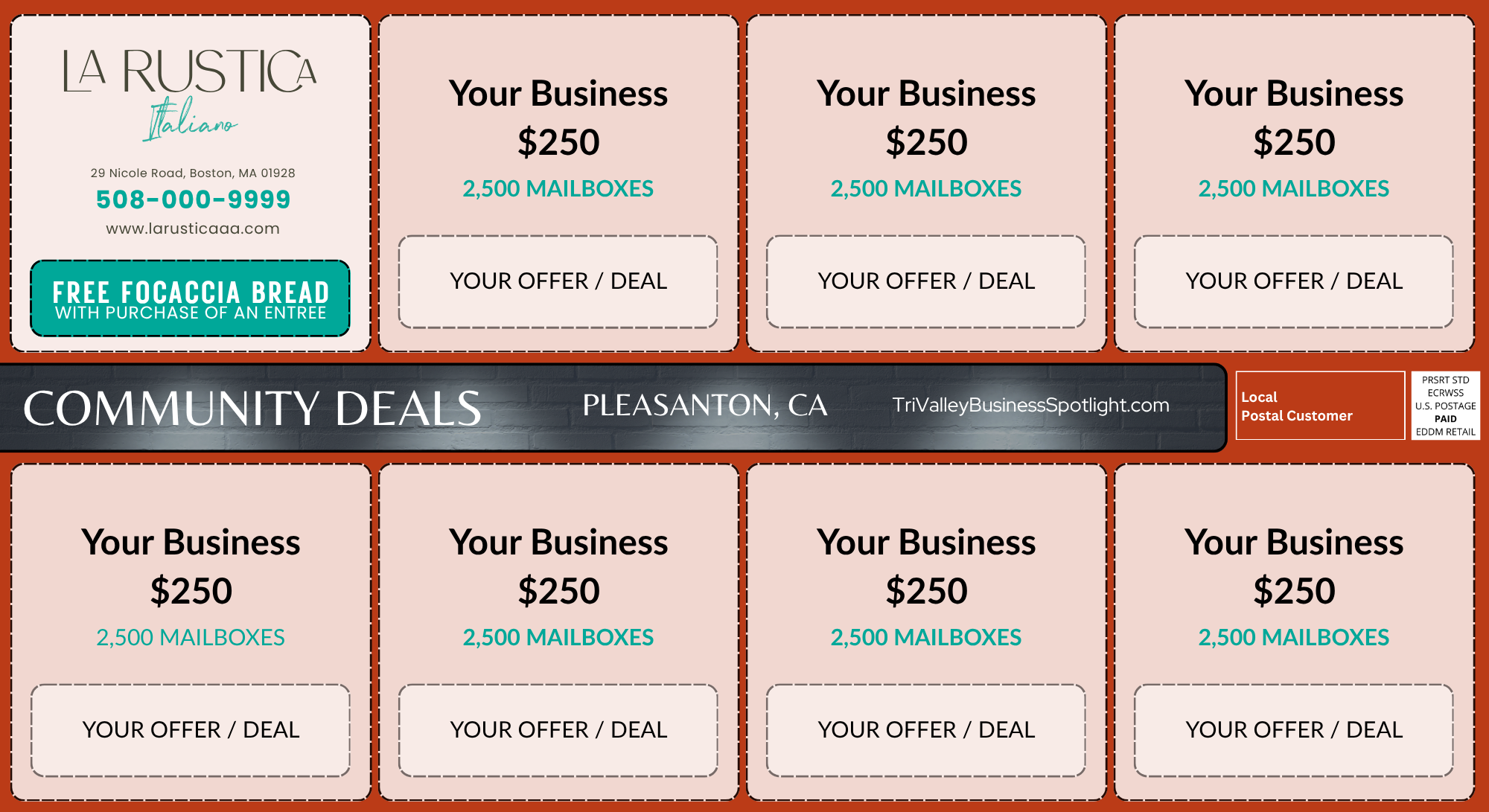 The Tri-Valley Business Spotlight is a large 9”x12” postcard mailer that offers small businesses an affordable and effective way to connect directly with the community. By pooling resources, each business gains valuable exposure while keeping costs low—it’s a win-win!